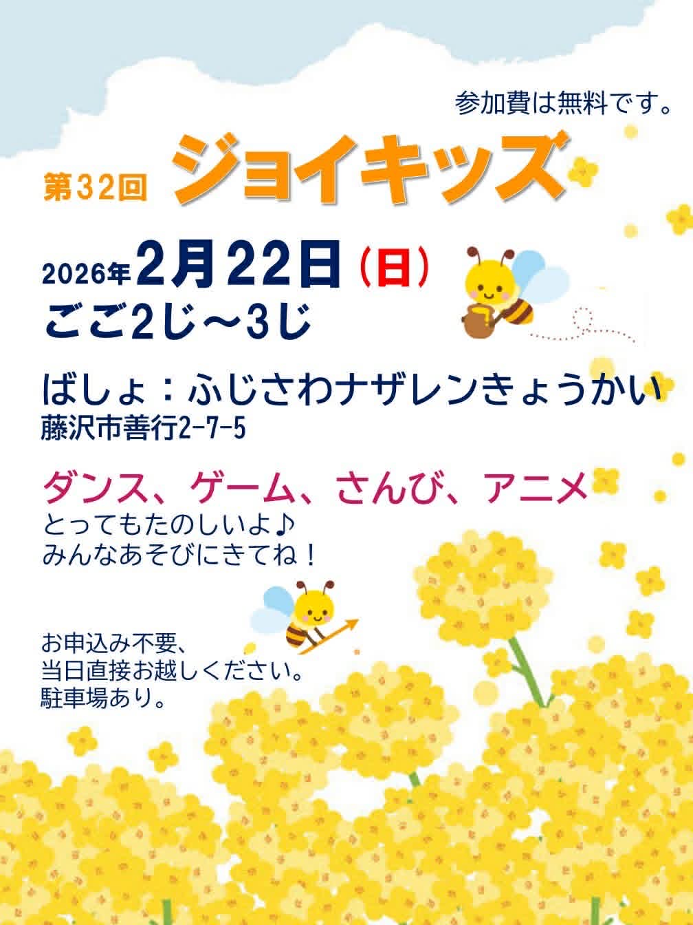 2月22日(日) 14時〜15寺ダンス、ゲーム、さんび、アニメ!